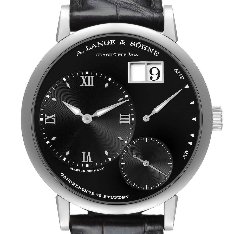 A. Lange & Sohne Grand Lange 1 White Gold Black Dial Mens Watch 117.028. Manual-winding movement. 18k white gold case 40.9 mm in diameter. Case thickness 8.8mm. Exhibition transparent sapphire crystal case back. Quick date-correction button located on the side of the case at the 10 o'clock position. 18k white gold smooth bezel. Scratch resistant sapphire crystal. Black dial with raised Roman numerals. Offset main dial. Small seconds sub-dial at 4 o'clock. Patented large double window date display located at 1 o'clock. Power reserve indicator at 3 o'clock. Black leather strap with white gold tang buckle.