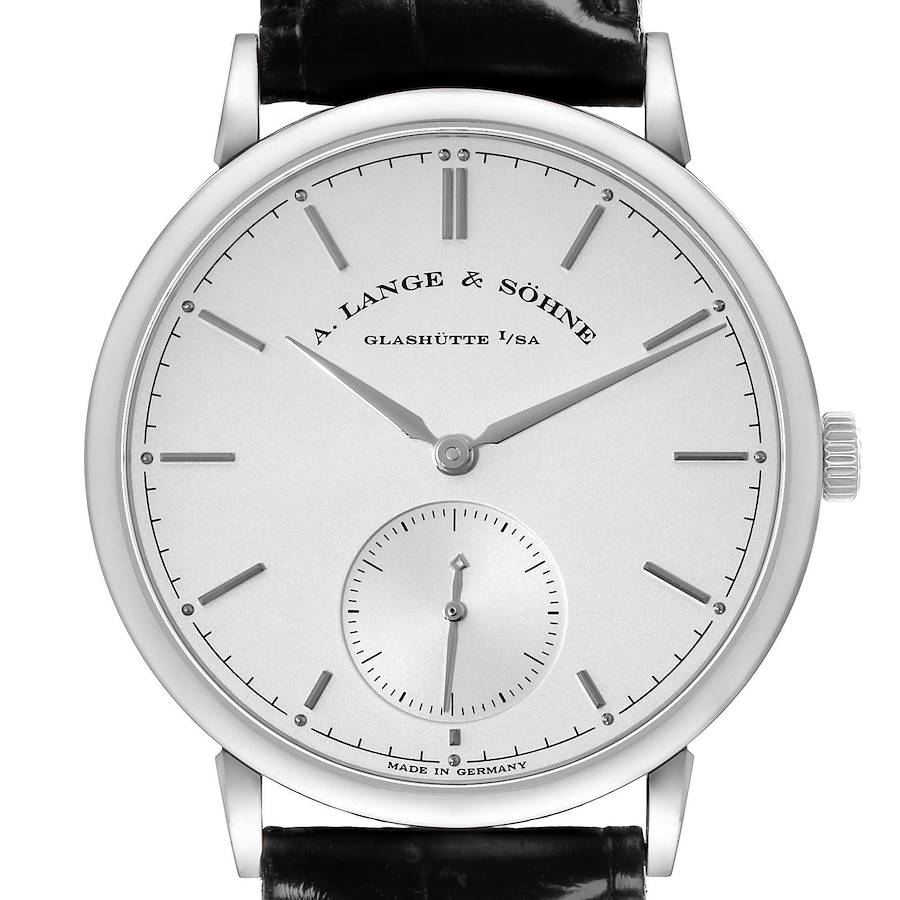 A. Lange & Söhne Saxonia White Gold Silver Dial Mens Watch 380.026. Automatic self-winding movement. 18k white gold case 38.5 mm in diameter. Exhibition sapphire case back. . Scratch resistant sapphire crystal. Silver dial with 18k white gold alpha-style hands, baton hour markers and a small seconds sub-dial at 6 o'clock. Black alligator leather strap with signed 18k white gold tang buckle.