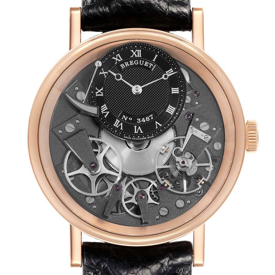 Breguet Tradition Skeleton Dial Rose Gold Mens Watch 7057BR Box Papers. Manual-winding movement. 18K rose gold coined-edged round case 40.0 mm in diameter. Breguet logo on the crown. 18K rose gold bezel. Scratch resistant sapphire crystal. Skeleton display dial. Silver hand-decorated dial with fine Guilloche pattern at the 12 o'clock position. Breguet-style hands and Roman numeral hour markers. Minute markers around the outer rim. Power Reserve Indicator mounted on the mainplate - on both the front and back of the watch. Black alligator leather strap with an 18K rose gold tang buckle.