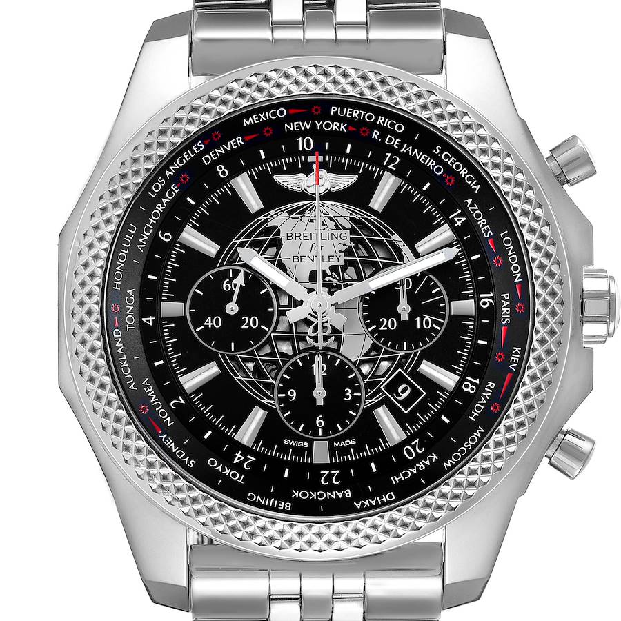 Breitling Bentley GMT B05 Unitime Black Dial Mens Watch AB0521. Self-winding automatic officially certified chronometer movement. Chronograph function. Stainless steel case 49.0 mm in diameter. Stainless steel screwed-down crown and pushers. Screw down case back. Stainless steel crisscrossed bidirectional rotating bezel. Scratch resistant sapphire crystal. Royal Ebony black dial. Luminescent stainless steel outlined hands. Globe design with longitude & latitude lines in the middle of the dial.World time around the outer rim. Date calendar window between 4 and 5. Three stepped-down stell outlined chronograph sub-dials -- 60 second, 30 minute and 12 hour. Large red tipped central seconds hand with the contrwaight Breitling logo. Stainless steel bracelet with deployant buckle. Fits 9 1/4" wrist.