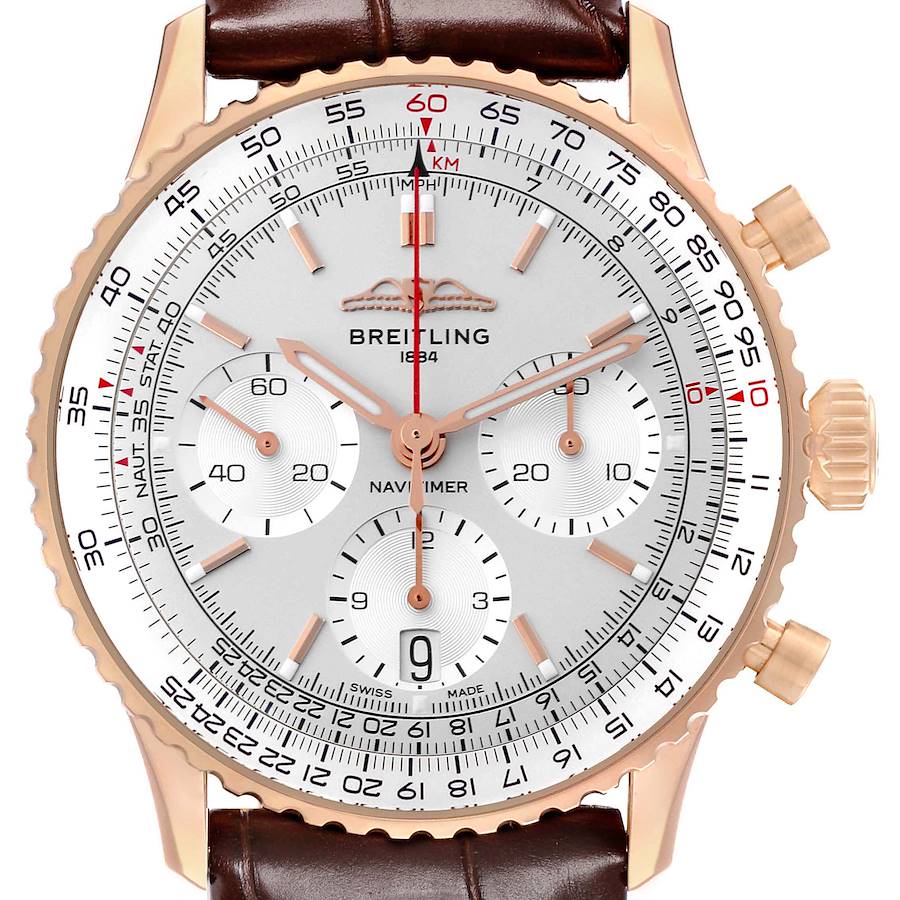 Breitling Navitimer B01 41mm Rose Gold Silver Dial Mens Watch RB0139 Box Card. Automatic self-winding officially certified chronometer chronograph movement. 18K rose gold case 41.0 mm in diameter. 18K rose gold crown and pushers. 18K rose gold bidirectional rotating reeded slide-rule bezel. Scratch resistant sapphire crystal. Silver dial with luminescent indexes. Three sunk guilloche subdials -- running seconds at 9 o'clock, 30 minutes at 3 o'clock, and 12 hours at 6 o'clock. Outer graduations for the tachymeter and the slide rule. Aperture for the date at the bottom of the 6 o'clock subdial. Luminescent rose gold baton hands. Red center chronograph seconds hand. Brown leather strap with 18K rose gold push-button deployant clasp.