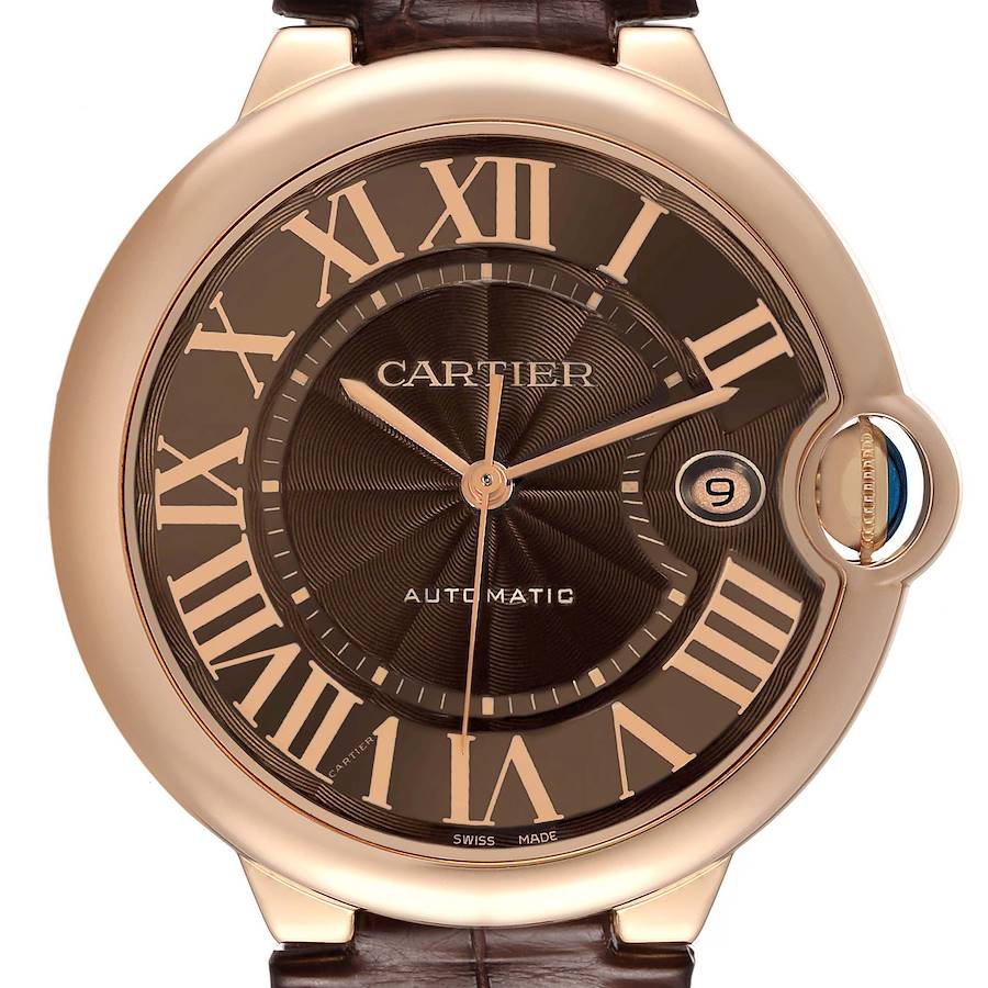 Cartier Ballon Bleu 42 Rose Gold Automatic Mens Watch W6920037. Automatic self-winding movement. 18K rose gold case 42.0 mm in diameter. Fluted crown set with the blue sapphire cabochon. 18K rose gold smooth bezel. Scratch resistant sapphire crystal. Brown guilloche dial with roman numerals. 18k rose gold sword shape hands. Minute markers around an inner ring. Date window at 3 o'clock aperture. Secret Cartier signature at VII. Brown leather strap with 18K rose gold deployant buckle.