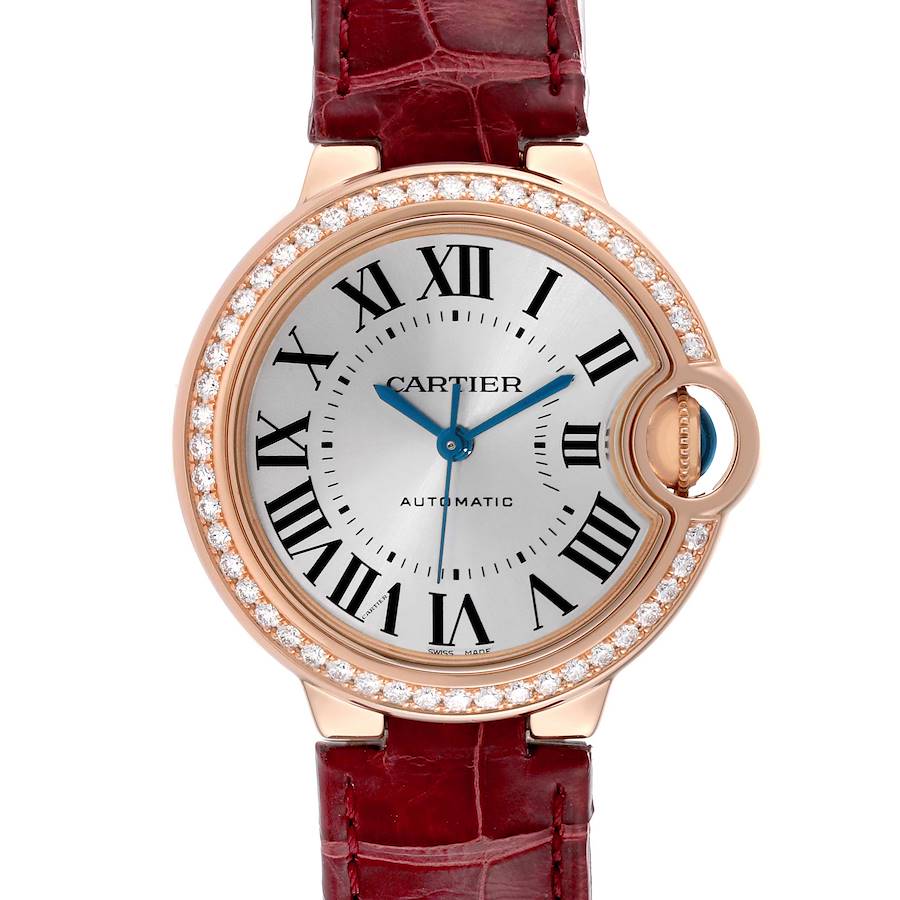 Cartier Ballon Bleu 33 Rose Gold Diamond Midsize Ladies Watch WJBB0033 Box Card. Automatic self-winding movement. 18K rose gold case 33 mm in diameter. Fluted crown set with the blue sapphire cabochon. 18K rose gold bezel with original Cartier factory diamonds. . Silver guilloche dial wth painted roman numerals. Blued-steel sword shape hands. Minute markers around an inner ring. Secret Cartier signature at VII. Red leather strap with 18k rose gold tang buckle.