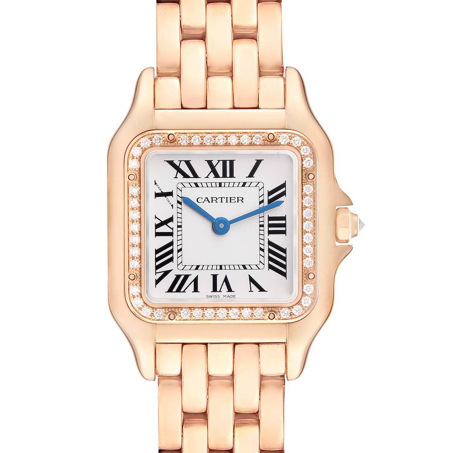 Cartier Panthere Medium Rose Gold Diamond Ladies Watch WJPN0009 Box Card. Quartz movement. 18k rose gold square case 27.0 x 36.0 mm in diameter. Octagonal crown set with an original Cartier factory diamond. Pointed crown guards. 18k rose gold original Cartier factory diamond set bezel. Scratch resistant sapphire crystal. Silver opalined dial with radial black Roman numeral hour markers and an inner minute track. Sword shaped blued-steel hands. Secret Cartier signature at X. 18k rose gold bracelet with hidden double deployant clasp. Fits a 7" wrist.