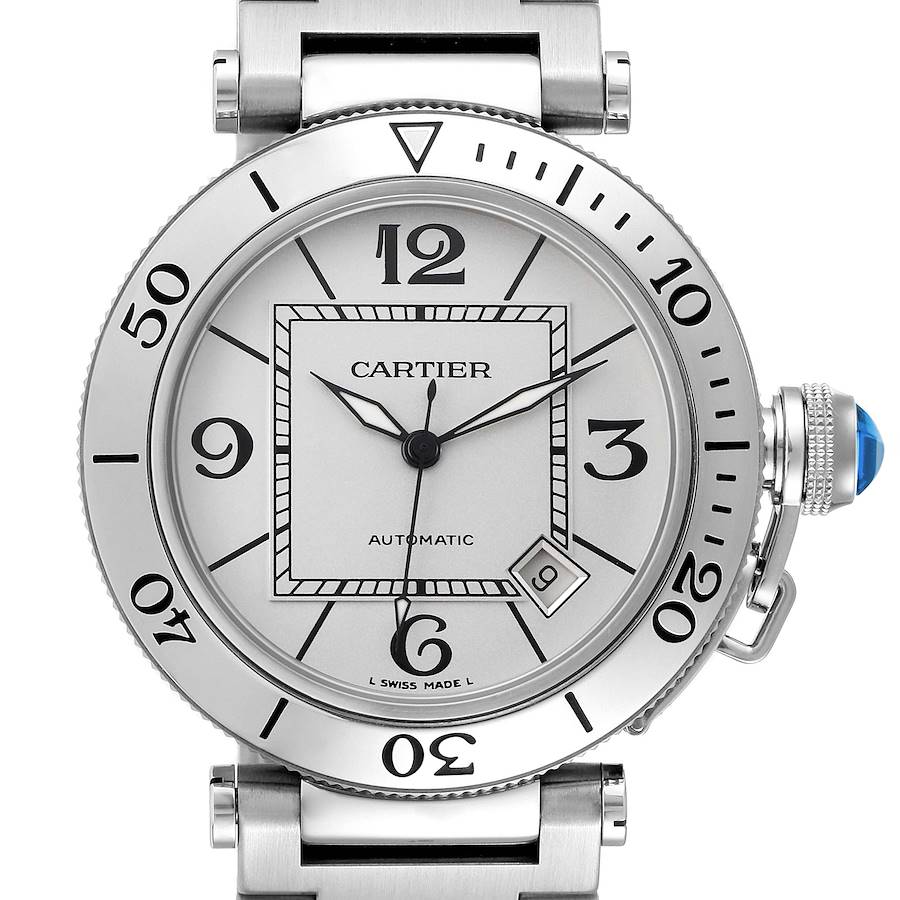 Cartier Pasha Seatimer Silver Dial Steel Automatic Mens Watch W31080M7. Automatic self-winding movement. Caliber 049. Stainless steel round case 40.5 mm in diameter. Crown cover set with a blue faceted spinel. Unidirectional rotating time-lapse bezel engraved with Arabic numeral 60-minute graduations. Scratch resistant sapphire crystal. Silver dial with black stick hour markers and luminescent diamond-shaped rhodium-plated hands. Black painted Arabic numerals at 3, 6, 9, and 12 o'clock. Inner minute track. Date calendar window between 4 and 5 o'clock. Stainless steel bracelet with a push-button double deployant clasp. Fits an 7.5" wrist.