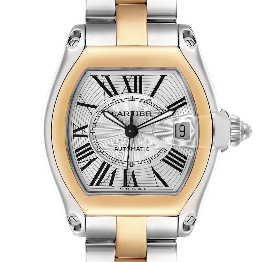 Cartier Roadster Steel Yellow Gold Silver Dial Mens Watch W62031Y4. Automatic self-winding movement. Stainless steel and 18K yellow gold tonneau-shaped case 38.0 x 43.0 mm. Radiator cap style crown. . Scratch resistant sapphire crystal with a cyclops magnifier. Silver sunray effect and guilloche dial with black radial Roman numeral hour markers and a recessed inner minute track. Luminescent sword-shaped oxidized hands. Date window at the 3 o'clock aperture. Secret Cartier signature at VII. Stainless steel and 18K yellow gold bracelet with a hidden double deployant clasp. Fits an 7 1/4" wrist.