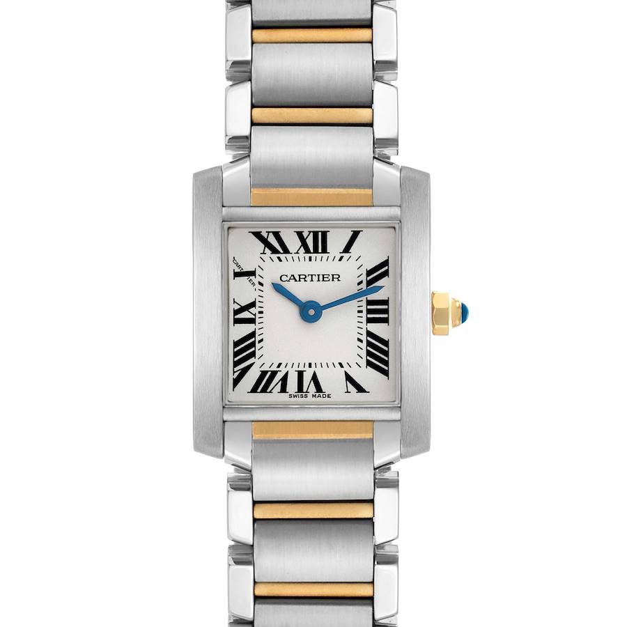Cartier Tank Francaise Small Steel Yellow Gold Ladies Watch W51007Q4. Quartz movement. Rectangular stainless steel case 25.0 x 20.0 mm. Octagonal 18k yellow gold crown set with a blue spinel cabochon. . Scratch resistant sapphire crystal. Silver opaline dial with black painted radial Roman numeral hour markers and an inner minute track. Sword-shaped blued steel hands. Secret Cartier signature at X. Stainless steel and 18k yellow gold bracelet with a hidden double deployant clasp. Fits a 6 1/4" wrist.