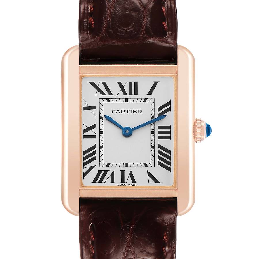 Cartier Tank Solo Rose Gold Steel Ladies Watch W5200024 Papers. Quartz movement. 18k rose gold rectangular case 30.0 x 24.4 mm. Stainless steel case back. Circular grained crown set with blue spinel cabochon. . Scratch resistant sapphire crystal. Silvered grained dial with black Roman numeral hour markers and an inner minute track. Blued steel sword-shaped hands. Secret Cartier signature at X. Brown leather strap with an 18k rose gold tang buckle.