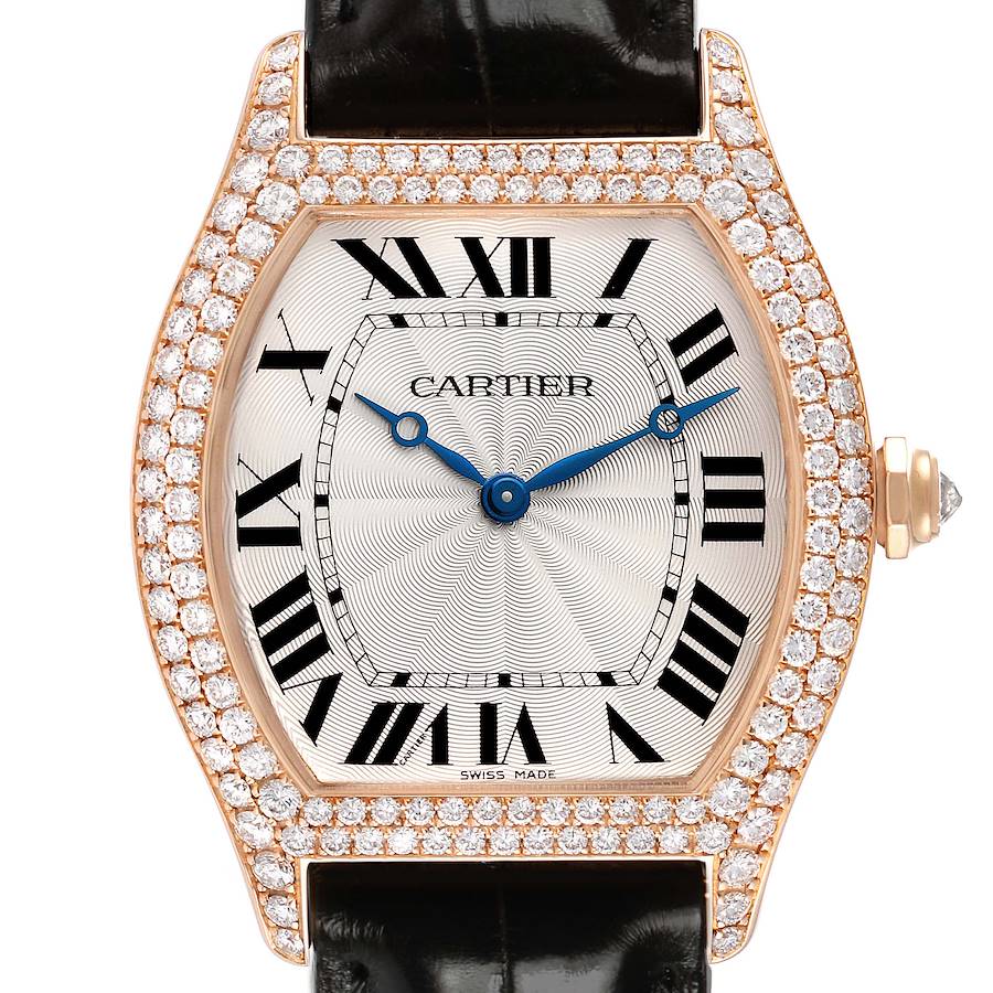 Cartier Tortue Rose Gold Diamond Bezel Ladies Watch WA503751. Manual winding movement. 18K rose gold tonneau case 34.0 x 42.0 mm. Octagonal crown set with an original Cartier factory diamond. Original Cartier factory diamond lugs. Exhibition sapphire caseback. 18K rose gold bezel set with original Cartier factory diamonds. Scratch resistant sapphire crystal. Silver guilloche dial with painted Roman numerals. Blued steel apple-shaped hands. Secret signature at X. Black leather strap with 18K rose gold deployant clasp.