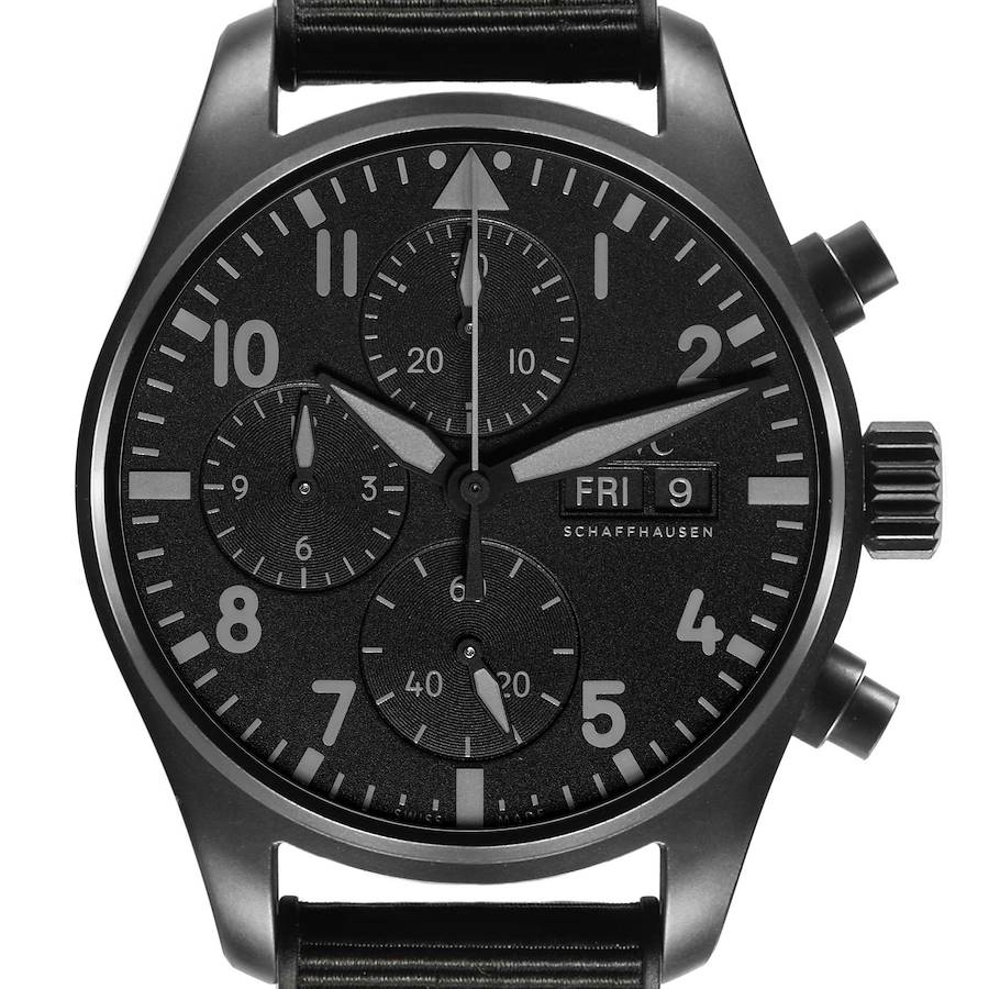 IWC Pilots Watch Chronograph 41 Top Gun Ceratanium Mens Watch IW388106 Box Card. Automatic self-winding chronograph movement. Ceratanium case 41.0 mm in diameter. Ceratanium bezel. Scratch resistant sapphire crystal. Black dial with luminescent hands and Arabic numerals. Day and date aperture at 3 o'clock. Three chronograph sub-dials -- 60-second, 30-minute, and 12-hour. Black rubber strap with textile inlay and tang buckle.
