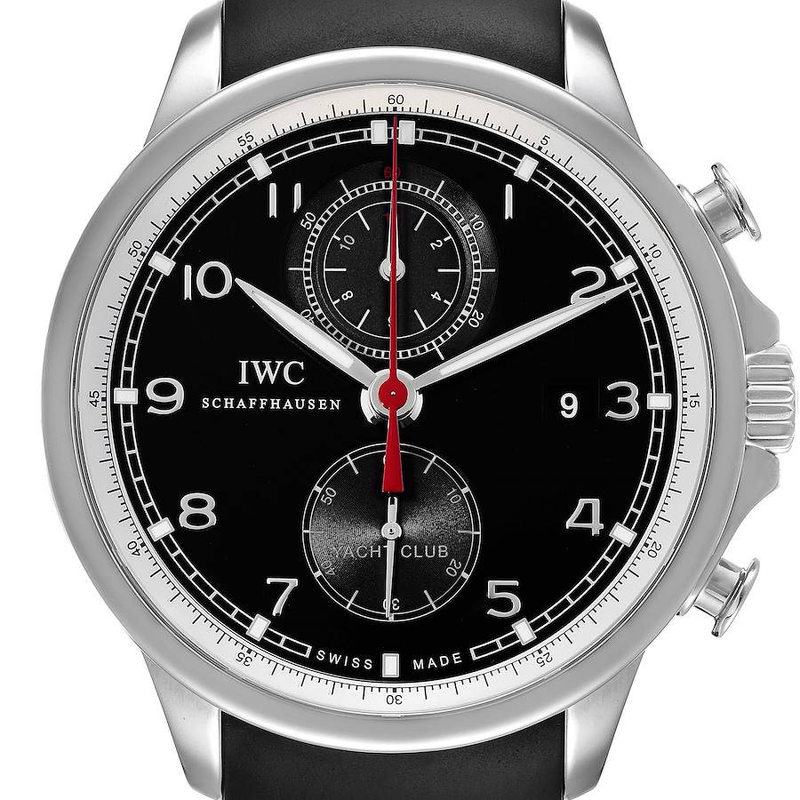 IWC Portuguese Yacht Club Chronograph Black Dial Steel Mens Watch IW390210. Automatic self-winding movement with 68 hour power reserve. Stainless steel case 45.4 mm in diameter. Exhibition sapphire case back. Stainless steel smooth bezel. Scratch resistant sapphire crystal. Black dial with applied steel Arabic numerals. White railroad minute track with lume plots every 5 minutes. White outer chapter ring for chronograph measurements. Date window at 3 o'clock. Running seconds subdial at 6 o'clock. Chronograph subdial at 12 o'clock with 60 minute and 12 hour counters. Black rubber strap with stainless steel deployant buckle.