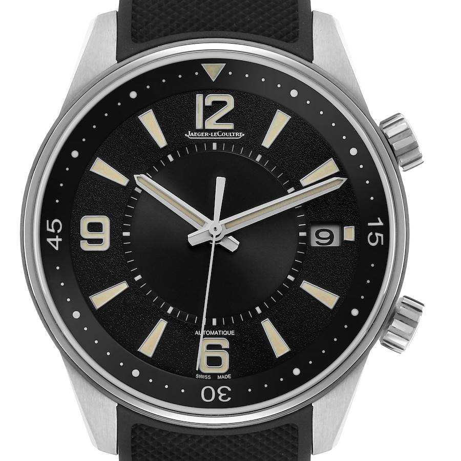 Jaeger Lecoultre Polaris Date Steel Mens Watch 842.8.37 Q9068670 Card. Automatic self-winding movement. Stainless steel case 42 mm in diameter. Crown at 10 o'clock for adjusting inner rotating bezel. Stainless steel smooth bezel. Scratch resistant sapphire crystal. Black dial with luminous index hour index markers, Arabic numerals at 6,9 and 12, and alpha hands. Outer track with 1/5 second and minute divisions. Date window at 3 o'clock. Black rubber strap with stainless steel double deployant buckle.