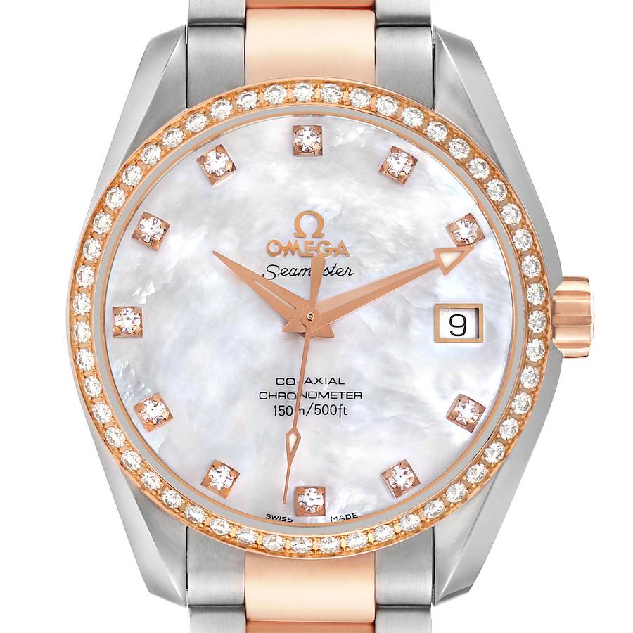 Omega Aqua Terra Steel Rose Gold Mother of Pearl Diamond Dial Watch 2309.75.00. Automatic self-winding movement. . Stainless steel round case 36.2 mm in diameter. Exhibition transparent case back. 18k rose gold bezel set with original Omega factory diamonds. Scratch resistant sapphire crystal. Mother-of-pearl dial with original Omega factory diamond hour markers. Luminous rose gold hands. Date window at 3 o'clock. Stainless steel and 18k rose gold bracelet with deployant clasp. Fits 6.5" wrist.
