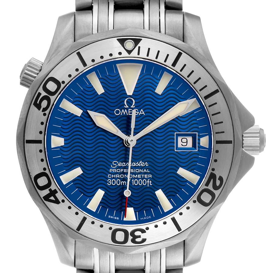 Omega Seamaster 300M Diver Blue Dial Titanium Mens Watch 2231.80.00. Officially certified chronometer automatic self-winding movement. Caliber 1120. Titanium round case 41.5 mm in diameter. Helium escape valve at 10 o'clock. Omega logo on the crown. Pointed crown guards. Solid case back. Unidirectional rotating time-lapse bezel engraved with 0-60 graduation. Scratch resistant sapphire crystal. Electric blue wave decor dial with luminescent diamond-shaped hands and hour markers. Date calendar at the 3 o'clock aperture. Titanium bracelet with a double push-button folding clasp. Fits a 8.5" wrist.