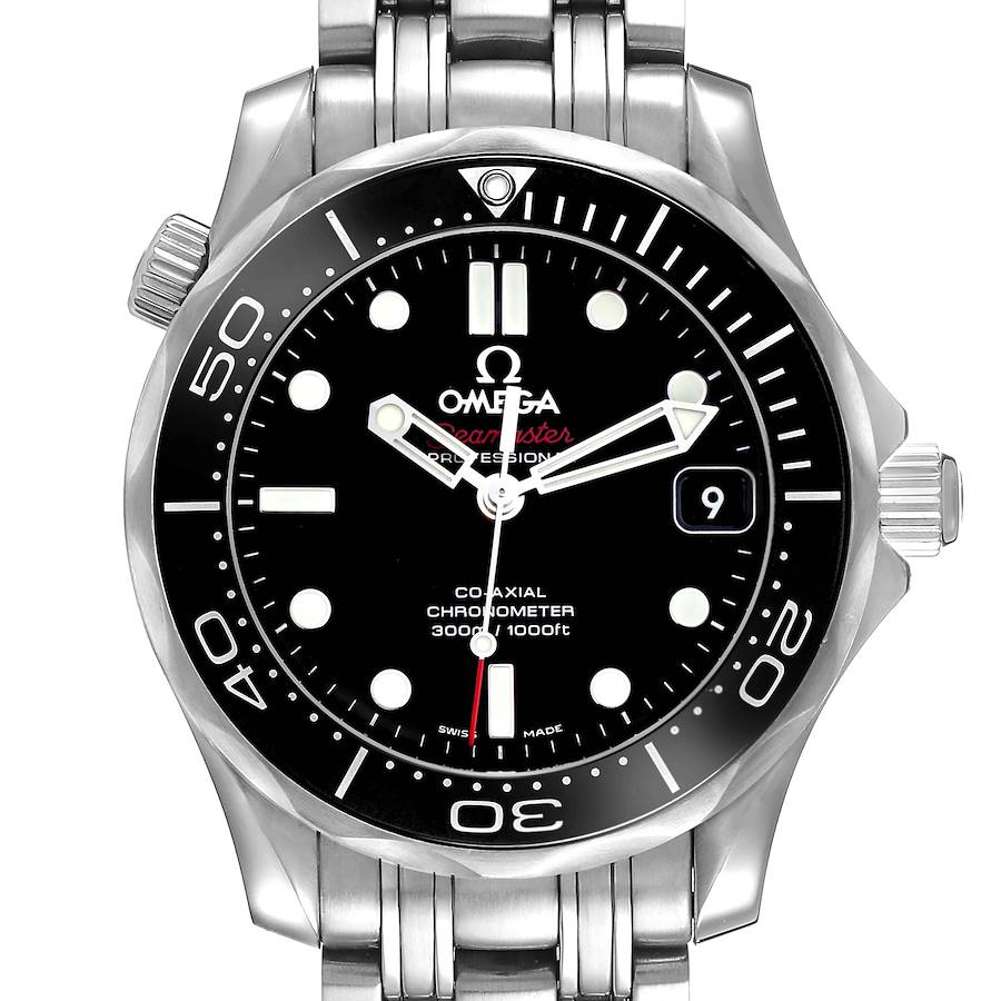 Omega Seamaster Diver 300M Midsize Steel Mens Watch 212.30.36.20.01.002. Automatic chronometer, Co-Axial Escapement movement with rhodium-plated finish. Stainless steel case 36.25 mm in diameter. Omega logo on the crown. Helium-escape valve at 10 o'clock. Pointed crown guards. Black ceramic unidirectional rotating bezel. Domed, scratch-resistant sapphire crystal with anti-reflective treatment on both sides. Black dial with luminescent skeletonized hands and dot hour markers. Luminescent lollipop-tipped centre seconds hand. Outer stick minute markers. Date window at the 3 o'clock aperture. Stainless steel bracelet with a double push-button deployant clasp. Fits a 7 3/4" wrist.