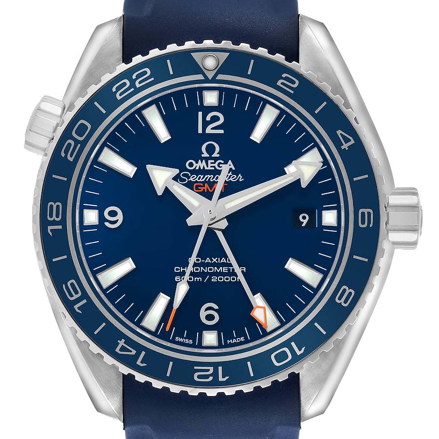 Omega Seamaster Planet Ocean 600m Titanium Mens Watch 232.92.44.22.03.001. Automatic self-winding chronometer movement with Co-Axial Escapement for greater precision, stability and durability. GMT with time zone function. Silicon balance-spring on free sprung-balance, 2 barrels mounted in series, automatic winding in both directions. Rhodium-plated balance bridge and oscillating mass. Titanium round case 43.5 mm in diameter. Helium escape valve at the 10 o'clock position. Transparent exhibition sapphire crystal caseback. Omega logo on the crown. Bi-directional rotating divers' titanium bezel with a blue ceramic top ring with GMT markers. Domed, scratch resistant sapphire crystal with anti-reflective treatment on both sides. Blue dial with luminescent index hour markers and broad arrow hands. Orange arrow-tipped GMT hand. Silver Arabic numerals at 6, 9, and 12. Date calendar window at 3 o'clock aperture. Blue rubber strap with titanium double push-button deployant clasp.
