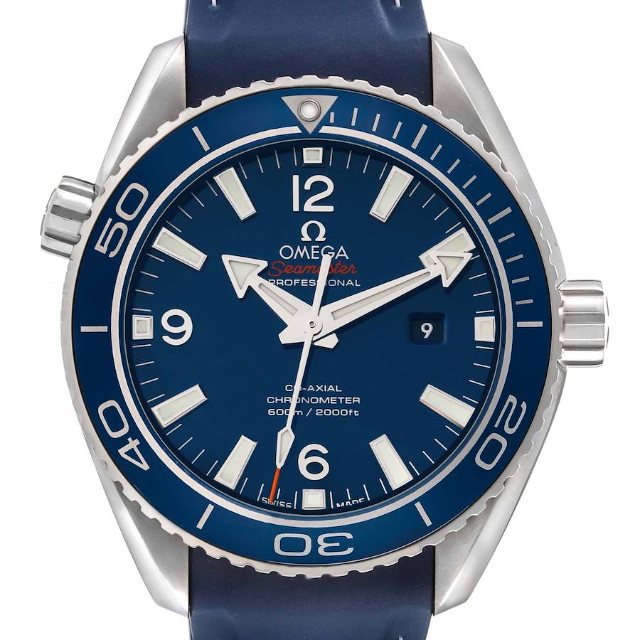 Omega Seamaster Planet Ocean Midsize Titanium Watch 232.92.38.20.03.001 Box Card. Automatic self-winding movement with Co-Axial escapement. Freesprung balance system with silicon balance spring.Automatic winding in both directions. Titanium round case 37.5 mm in diameter. Helium Escapement Valve at the 10 o'clock position. Transparent exhibition sapphire crystal case back. Blue ceramic unidirectional rotating bezel. Satin-finished Liquidmetal diving scale. Domed scratch resistant sapphire crystal with anti-reflective coating. Blue dial with luminescent index hour markers and broad arrow hands. Raised steel Arabic numerals at 6, 9, and 12 o'clock. Date calendar at the 3 o'clock aperture. Blue rubber strap with a stainless steel double push-button deployant clasp.