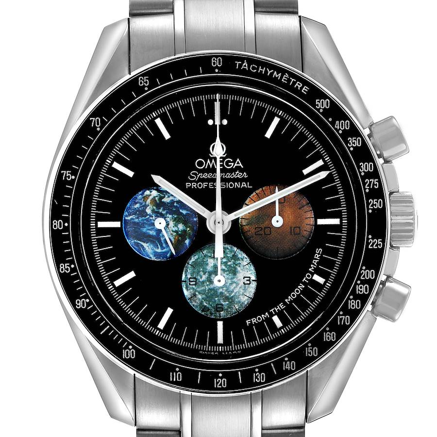 Omega Speedmaster Limited Edition Moon to Mars Steel Mens Watch 3577.50.00. Manual-winding chronograph movement. Stainless steel round case 42.0 mm in diameter. Stainless steel bezel with black tachymeter insert. Hesalite acrylic crystal. Black dial with luminescent hands and hour markers. Three chronograph subdials -- small running seconds, 30-minute recorder, and a 12-hour recorder designed as Earth, Mars, and the Moon. Stainless steel bracelet with push button fold over clasp. Fits a 7 3/4" wrist.