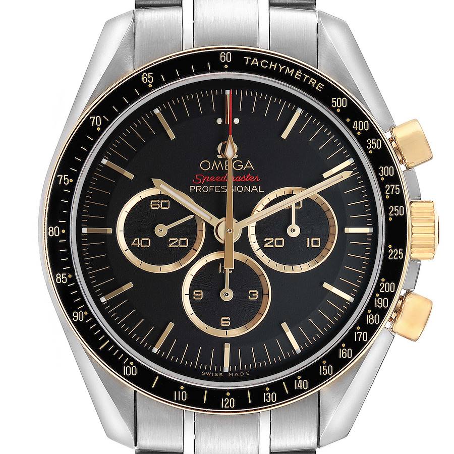 Omega Speedmaster Tokyo 2020 LE Steel Mens Watch 522.20.42.30.01.001 Box Card. Manual winding chronograph movement. Stainless steel round case 42.0 mm in diameter. 18k yellow gold crown with Omega logo. 18k yellow gold bezel with black aluminum tachymeter insert. Scratch resistant sapphire crystal. Black dial with 18k yellow gold indexes and three engine-turned subdials -- 30 minute register, 12 hour register, and constant seconds. Luminescent baton hands and hour markers. Stainless steel bracelet with double push button deployant clasp. Fits up to 8 1/4" wrist.