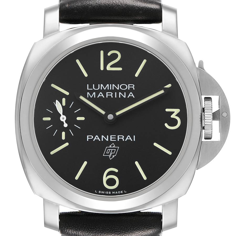 Panerai Luminor Marina 44mm Steel Black Dial Mens Watch PAM00776. Manual-winding movement. Two part cushion shaped stainless steel case 44 mm in diameter. Panerai patented crown protector. Polished stainless steel sloped bezel. Scratch resistant sapphire crystal. Black dial with luminous hands and stick hour markers. Arabic numerals at 3,6 and 12 o'clock positions. Small seconds sub dial at the 9 o'clock position. Black leather strap with stainless steel tang buckle.