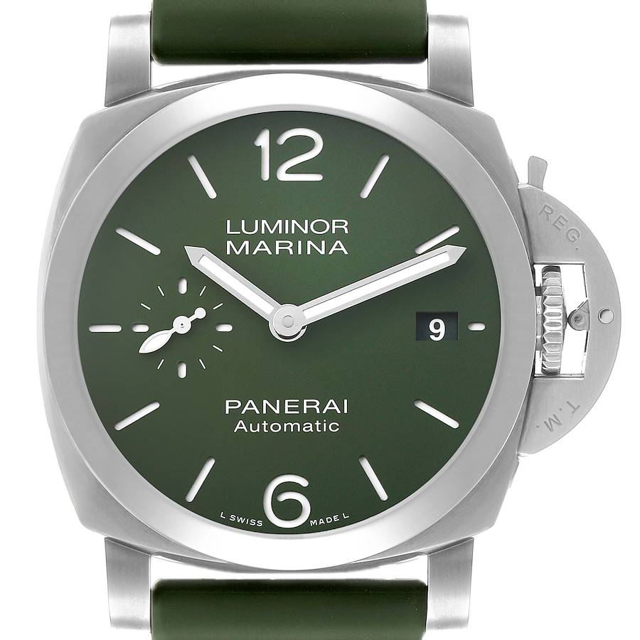 Panerai Luminor Quaranta Steel 40 Green Dial Mens Watch PAM01304 Box Card. Automatic self-winding movement. Two part cushion shaped steel case 40.0 mm in diameter. Panerai patented crown protector. Green leather strap with steel tang buckle. Scratch resistant sapphire crystal. Green dial with luminous hands and stick hour markers. Arabic numerals at 6 and 12 o'clock positions. Small seconds sub dial at the 9 o'clock position. Date window at 3. Green leather strap with steel tang buckle.
