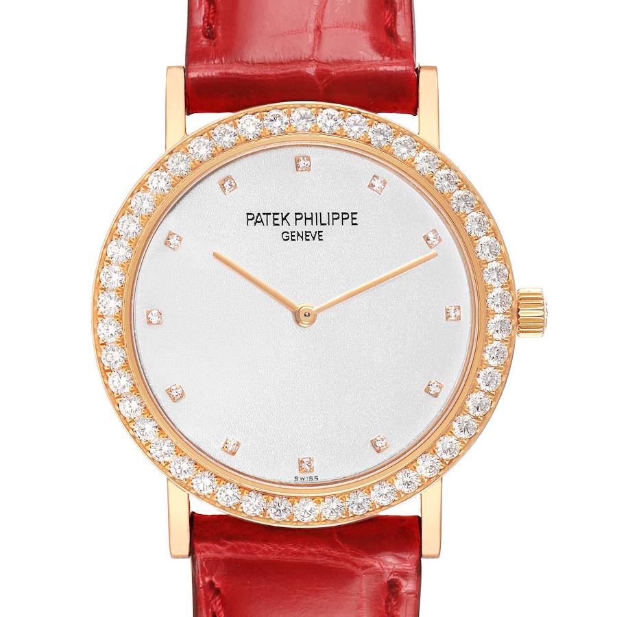 Patek Philippe Calatrava Rose Gold Silver Dial Diamond Mens Watch 5006 5006R Papers. Manual-winding movement. 18k rose gold case 33.5 mm in diameter. Original Patek factory diamond bezel. Scratch resistant sapphire crystal. Silver dial with rose gold baton hands, original Patek factory diamond hour markers. Red leather strap with rose gold tank buckle.