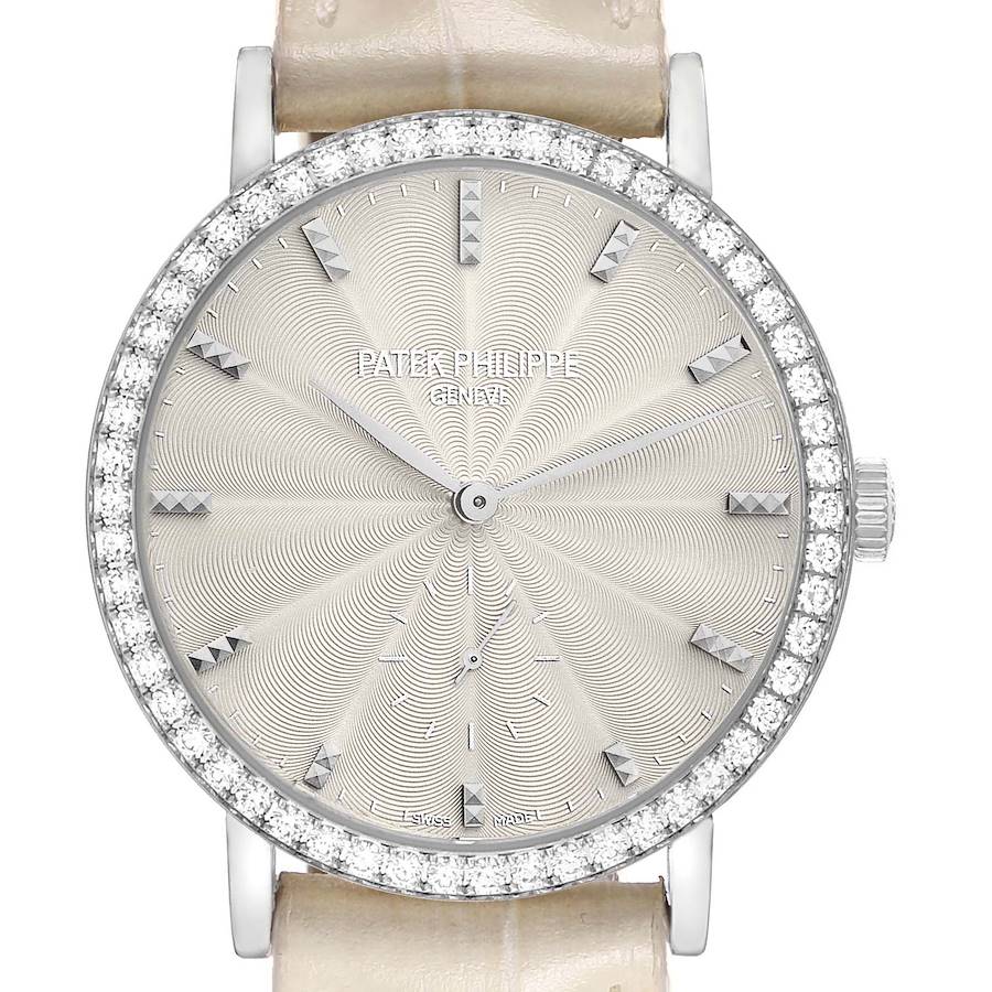 Patek Philippe Calatrava White Gold Diamond Ladies Watch 7120 7120G. Manual-winding movement. 18k white gold case 31.0 mm in diameter. Exhibition transperrent sapphire crystal case back. 18k white gold Patek factory diamond bezel. Scratch resistant sapphire crystal. Cream guilloche dial with white gold baton hour markers and dauphine hands. Subdial at 6 o'clock position. White cream leather strap with 18K white gold tang buckle.