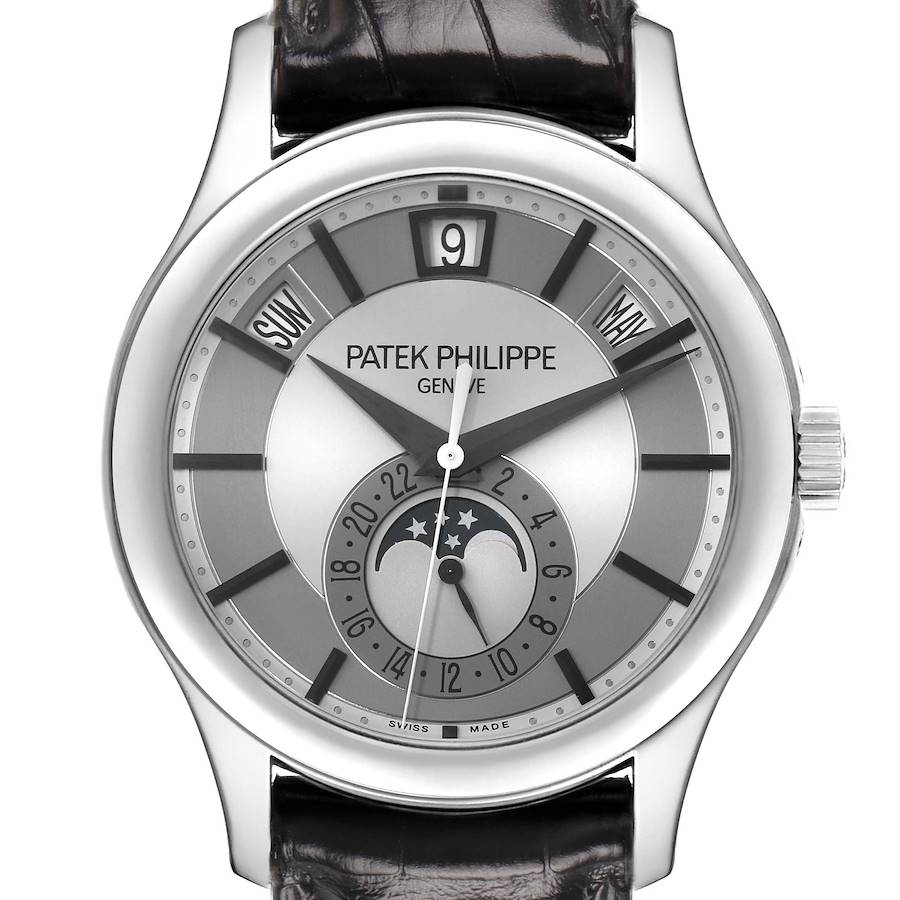 Patek Philippe Complications Annual Calendar White Gold Mens Watch 5205 5205G. Automatic self-winding movement. 18k white gold case 40.0 mm in diameter. Exhibition sapphire crystal case back. 18k white gold bezel. Scratch resistant sapphire crystal. Silver dial with applied white gold baton hour markers. White gold epee hands. Annual calendar complication displaying the Day, Date & Month through windows located beneath the 10, 12 and 2 o'clock positions. Sub-dial at the 6 o'clock position doubles as the Moonphase & an AM/PM indicator. Black leather strap with 18K white gold tang buckle.
