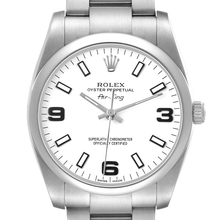 Rolex Air King 34 Steel White Dial Mens Watch 114200. Officially certified chronometer self-winding movement. Stainless steel oyster case 34.0 mm in diameter. Rolex logo on the crown. Stainless steel smooth domed bezel. Scratch resistant sapphire crystal. White dial with luminescent baton hands and hour markers. Raised blackened Arabic numerals at 3, 6, and 9 o'clock. Stainles steel oyster bracelet with a fold-over clasp. Fits up to a 7 1/4" wrist.
