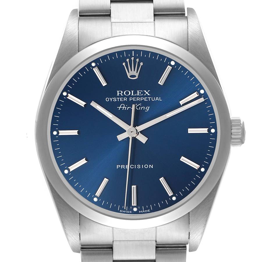 Rolex Air King Blue Dial Smooth Bezel Steel Mens Watch 14000. Automatic self-winding movement. Stainless steel oyster case 34.0 mm in diameter. Rolex logo on the crown. Stainless steel smooth domed bezel. Scratch resistant sapphire crystal. Blue dial with luminescent baton hands and hour markers. Outer minute and 1/2-second markers. Stainless steel oyster bracelet with a fold-over clasp. Fits a 7 1/4" wrist.