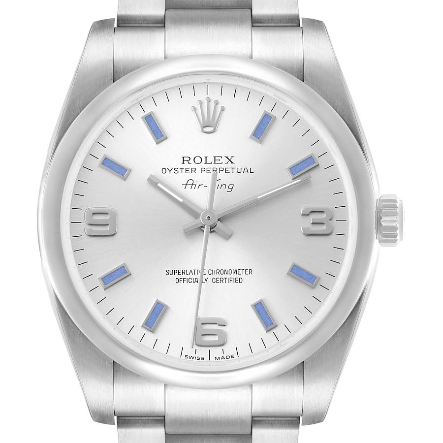 Rolex Air King Silver Dial Blue Hour Markers Steel Mens Watch 114200. Officially certified chronometer automatic self-winding movement. Stainless steel oyster case 34.0 mm in diameter. Rolex logo on the crown. Stainless steel smooth domed bezel. Scratch resistant sapphire crystal. Silver dial with applied Arabic numerals and blue luminous baton hour markers. Stainless steel oyster bracelet with fold over clasp. Fits up to a 7" wrist.