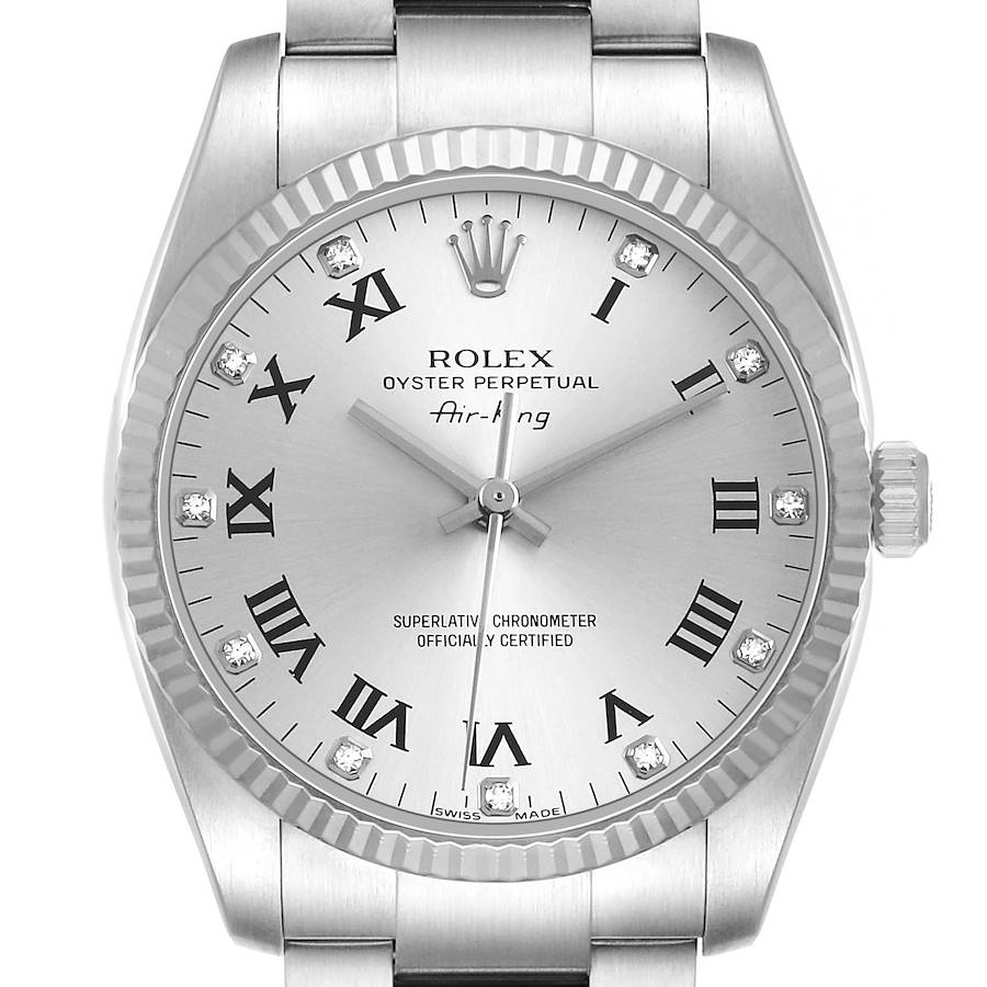 Rolex Air King Silver Roman Diamond Dial Steel White Gold Mens Watch 114234. Officially certified chronometer automatic self-winding movement. Stainless steel oyster case 34.0 mm in diameter. Rolex logo on the crown. 18K white gold fluted bezel. Scratch resistant sapphire crystal. Silver dial with Roman numeral hour markers with original Rolex factory diamond accents. White gold baton hands. Stainless steel Oyster bracelet with Oysterlock clasp. Fits up to a 7 1/4" wrist.