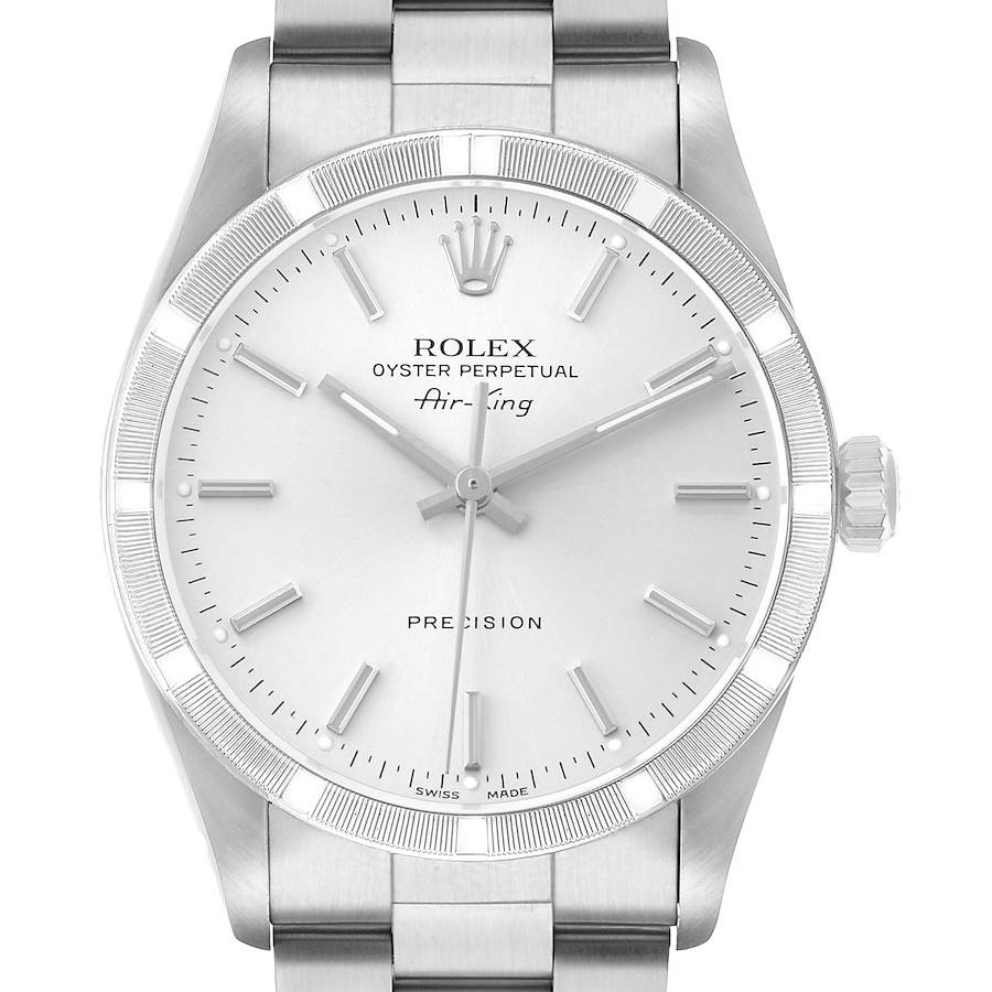 Rolex Air King Steel Engine Turned Bezel Silver Dial Mens Watch 14010. Automatic self-winding movement. Stainless steel case 34.0 mm in diameter. Rolex logo on the crown. Stainless steel engine turned bezel. Scratch resistant sapphire crystal. Silver dial with raised steel baton hour markers and hands. Stainless steel oyster bracelet with fold over clasp. Fits a 7 1/4" wrist.