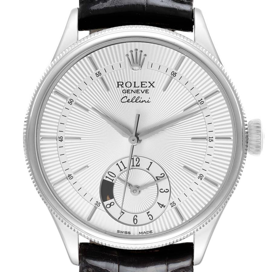 Rolex Cellini Dual Time White Gold Automatic Mens Watch 50529 Box Card. Officially certified chronometer automatic self-winding movement. 18K white gold round case 39 mm in diameter. Rolex logo on crown. . Scratch resistant sapphire crystal. Silver sunburst guilloche dial with white gold hands and raised polished baton hour markers. Fine printed minute/seconds track. Second time zone at 6 o'clock with day/night indicator. Black leather strap with an 18K white gold tang buckle.