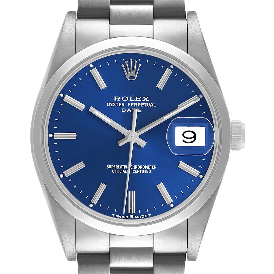 Rolex Date Blue Dial Smooth Bezel Steel Mens Watch 15200. Officially certified chronometer automatic self-winding movement. Stainless steel oyster case 34.0 mm in diameter. Rolex logo on the crown. Stainless steel smooth domed bezel. Scratch resistant sapphire crystal with a cyclops magnifier. Blue dial with steel baton hour markers and luminescent hands. Date calendar at the 3 o'clock aperture. Outer stick minute markers. Stainless steel oyster bracelet with a folding clasp. Fits a 7 1/4" wrist.