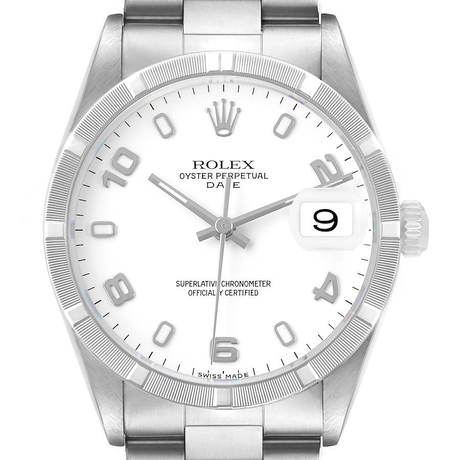 Rolex Date Steel White Dial Engine Turned Bezel Mens Watch 15210. Officially certified chronometer self-winding movement. Stainless steel oyster case 34.0 mm in diameter. Rolex logo on the crown. Stainless steel engine turned bezel. Scratch resistant sapphire crystal with cyclops magnifier. White dial with applied luminous baton hour markers and Arabic numerals. Date window at 3 o'clock aperture. Stainless steel oyster bracelet with fold over clasp. Fits a 7 1/2" wrist.