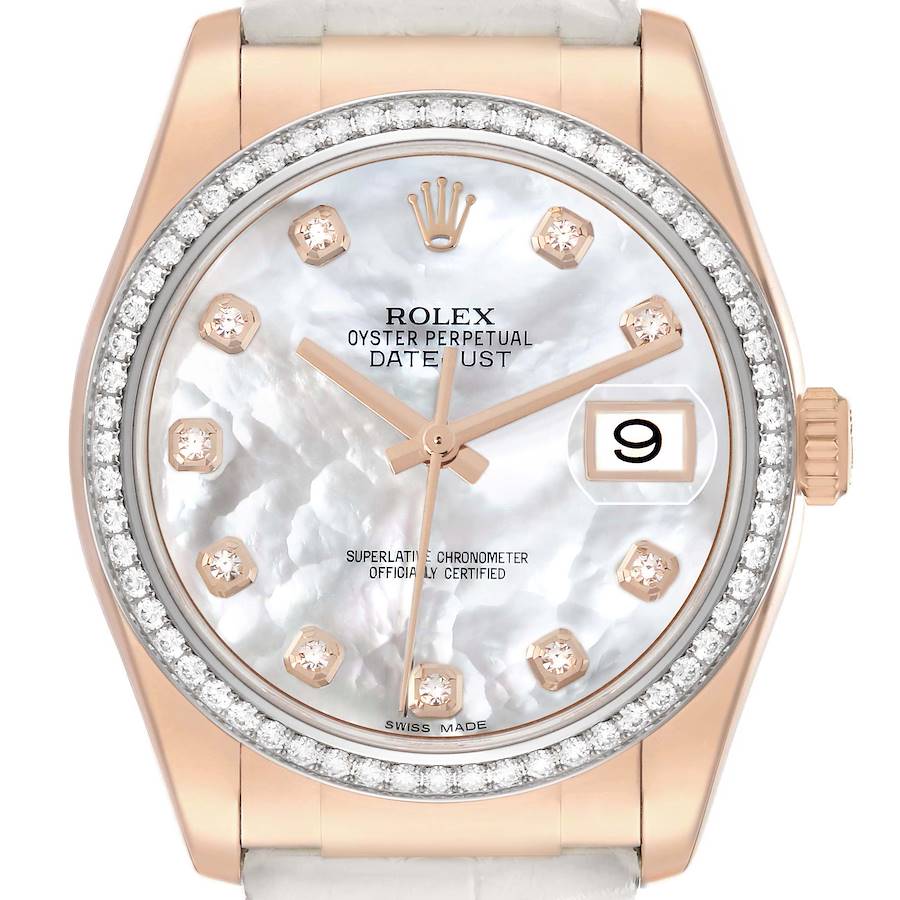 Rolex Datejust Rose Gold Mother of Pearl Diamond Mens Watch 116185 Box Card. Officially certified chronometer self-winding movement. 18k rose gold oyster case 36.0 mm in diameter. Rolex logo on the 18k rose gold crown. 18k rose gold with original Rolex factory diamond bezel. Scratch resistant sapphire crystal with cyclops magnifier. Mother of pearl dial with original Rolex factory diamond hour markers. Date window at 3 o'clock aperture. White leather strap with 18k rose gold deployant buckle.