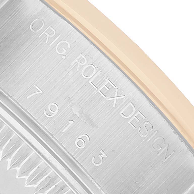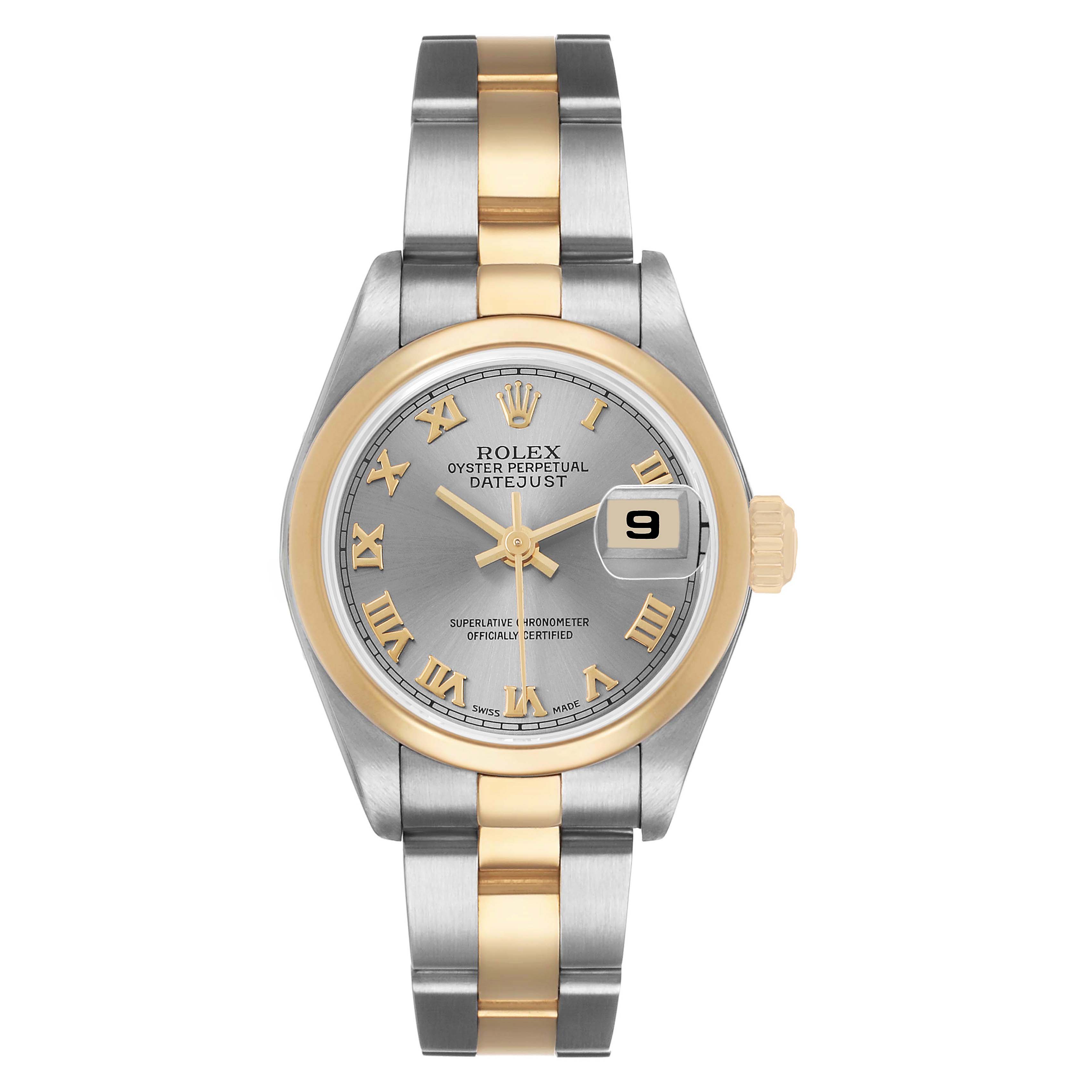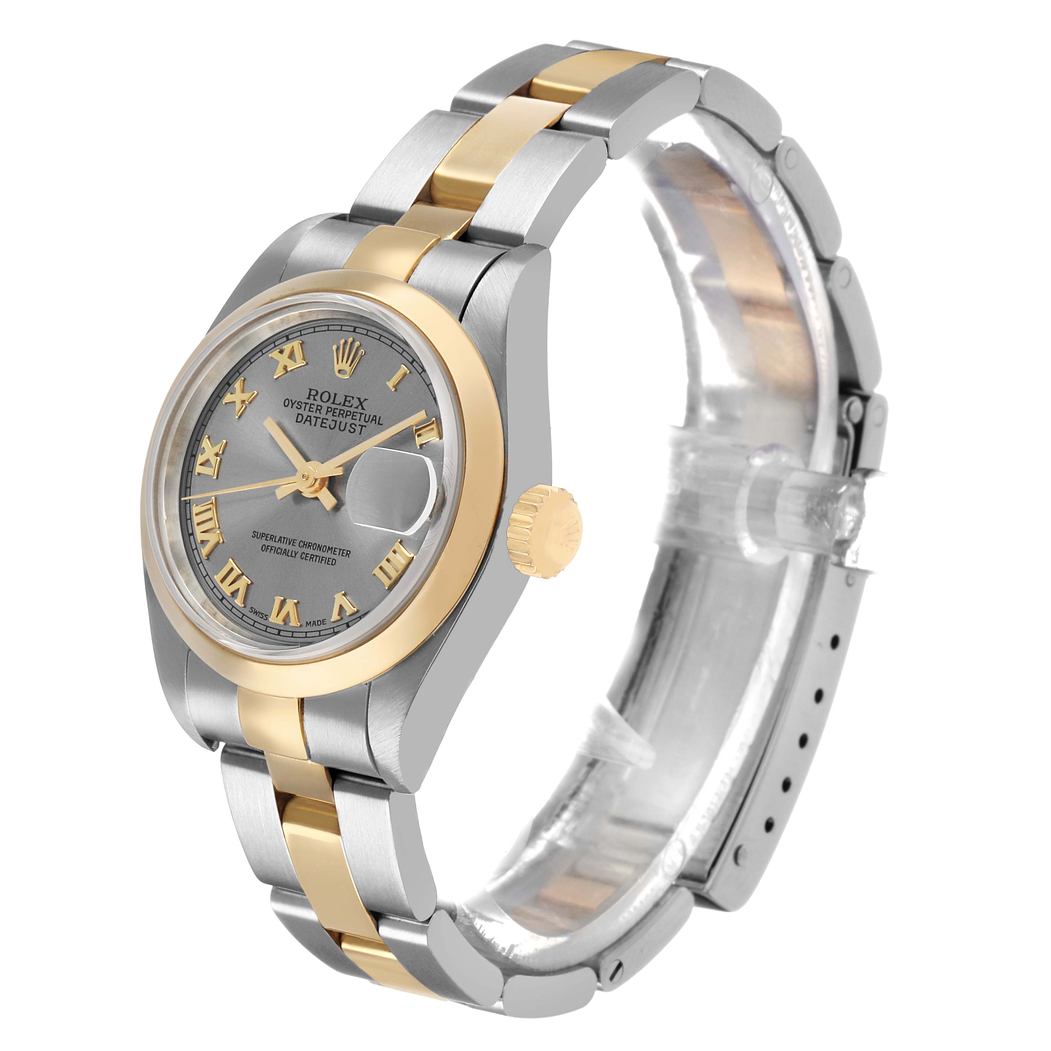 Rolex Datejust 26 Steel Yellow Gold Slate Roman Dial Ladies Watch 79163. Officially certified chronometer self-winding movement. Stainless steel oyster case 26 mm in diameter. Rolex logo on a 18k yellow gold crown. 18k yellow gold smooth domed bezel. Scratch resistant sapphire crystal with Cyclops magnifier. Slate dial with raised gold roman numerals. Date calendar at 3 o'clock aperture. Stainless steel and 18k yellow gold oyster bracelet with a fold over clasp. Fits a 6 1/4" wrist.