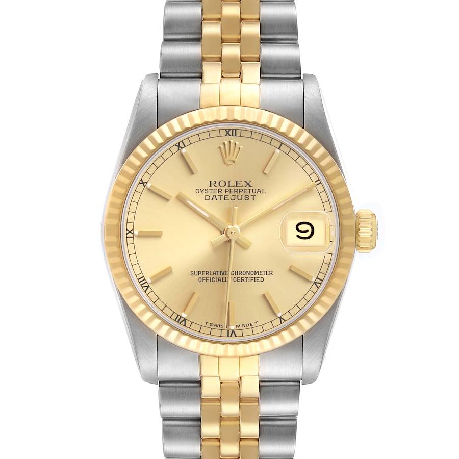 Rolex Datejust 31 Midsize Steel Yellow Gold Ladies Watch 68273. Officially certified chronometer automatic self-winding movement. Stainless steel oyster case 31.0 mm in diameter. Rolex logo on the 18K yellow gold crown. 18k yellow gold fluted bezel. Scratch resistant sapphire crystal with a cyclops magnifier. Champagne dial with tritium-inlay yellow gold baton hour markers and hands. Date calendar at the 3 o'clock aperture. Stainless steel and 18k yellow gold jubilee bracelet with a folding clasp. Fits a 6 3/4" wrist.