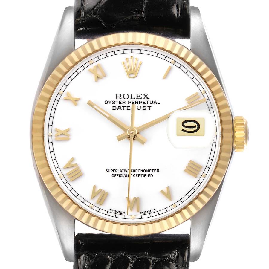Rolex Datejust 36 White Roman Dial Steel Yellow Gold Mens Watch 16013. Officially certified chronometer automatic self-winding movement. Stainless steel oyster case 36.0mm in diameter. Rolex logo on the 18K yellow gold crown. 18k yellow gold fluted bezel. Acrylic crystal with cyclops magnifier. White dial with raised yellow gold Roman numeral hour markers and luminescent yellow gold hands. Date calendar at the 3 o'clock aperture. Black leather strap with custom buckle.