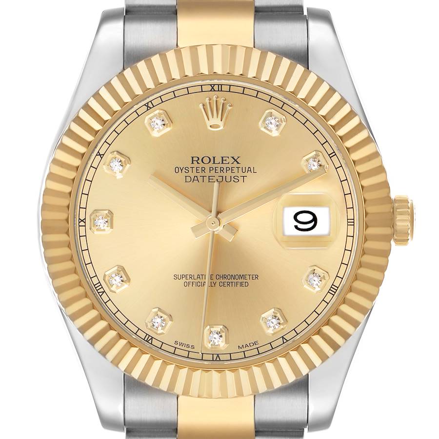 Rolex Datejust II 41 Champagne Diamond Dial Steel Yellow Gold Mens Watch 116333. Officially certified chronometer self-winding movement. Stainless steel and 18K yellow gold oyster case 41.0 mm in diameter. Rolex logo on the 18K yellow gold crown. 18K yellow gold fluted bezel. Scratch resistant sapphire crystal with a cyclops magnifier. Champagne dial with original Rolex factory diamond hour markers and yellow gold baton hands. Date calendar at the 3 o'clock aperture. Stainless steel and 18K yellow gold oyster bracelet with an oysterlock clasp. Fits a 7.5" wrist.