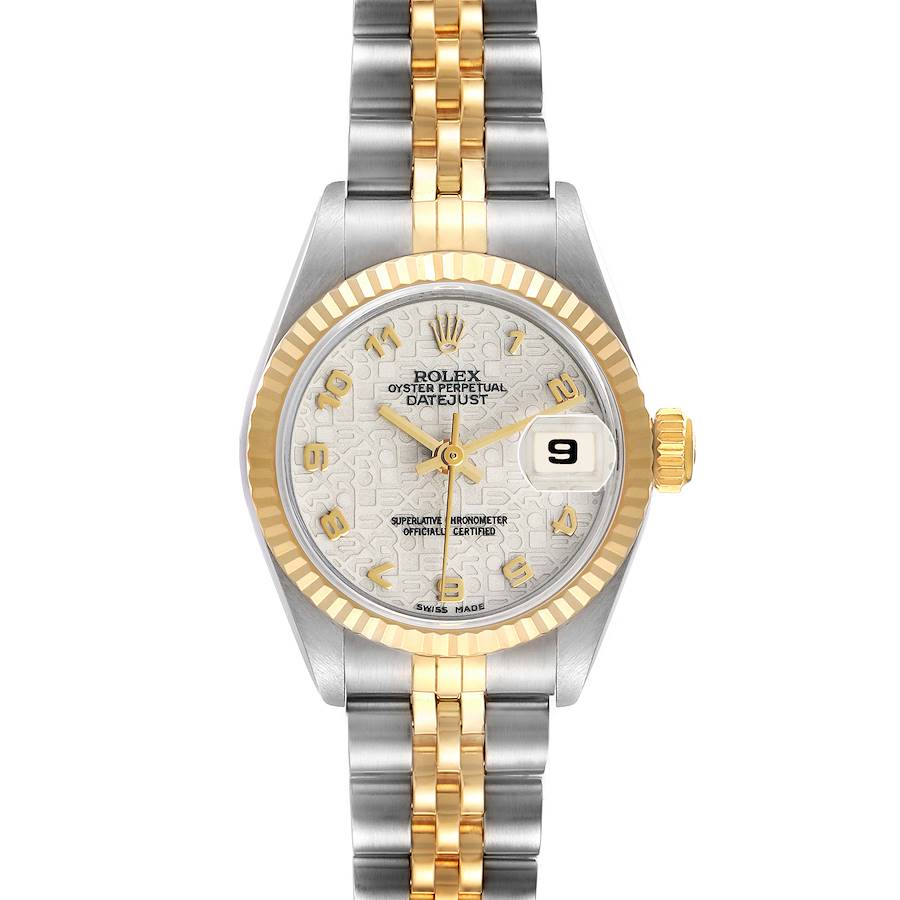 Rolex Datejust Ivory Anniversary Dial Steel Yellow Gold Ladies Watch 69173. Officially certified chronometer automatic self-winding movement. Stainless steel and 18k yellow gold oyster case 26.0 mm in diameter. Rolex logo on the 18k yellow gold crown. 18k yellow gold fluted bezel. Scratch resistant sapphire crystal with a cyclops magnifier. Ivory jubilee anniversary dial with raised yellow gold Arabic numeral hour markers and luminescent baton hands. Date calendar at the 3 o'clock aperture. Stainless steel and 18k yellow gold jubilee bracelet with a fold-over clasp. Fits a 6 1/2" wrist.