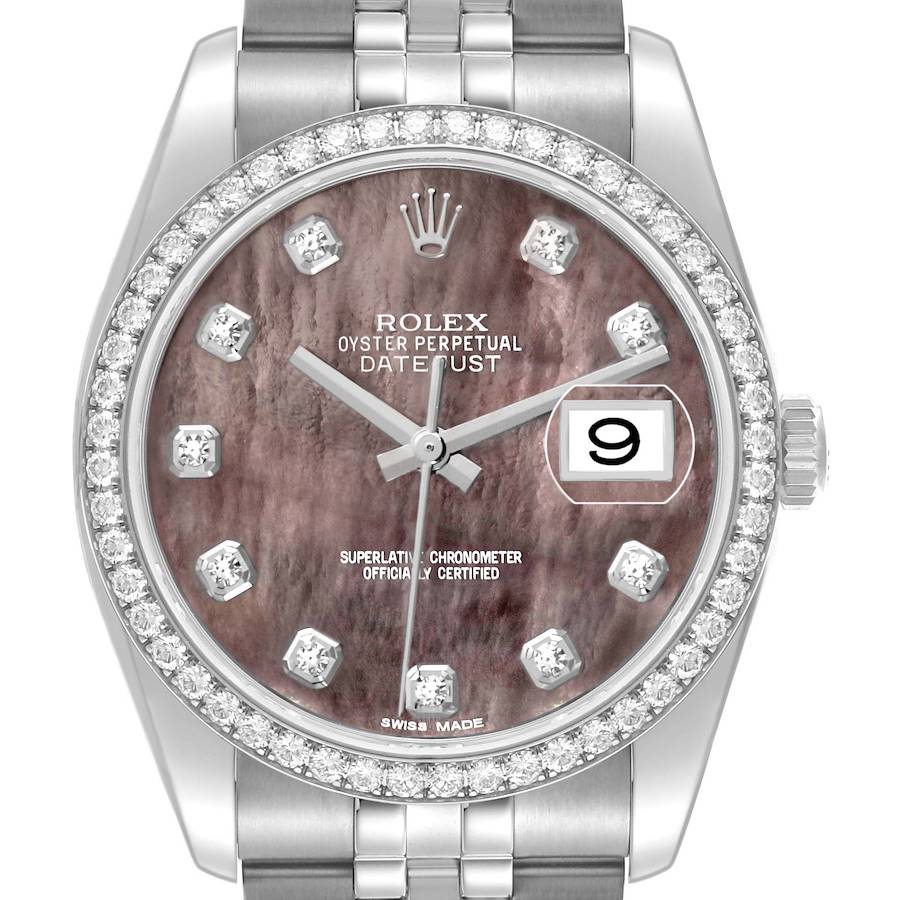 Rolex Datejust Mother Of Pearl Diamond White Gold Steel Mens Watch 116244. Officially certified chronometer self-winding movement. Stainless steel oyster case 36.0 mm in diameter. Rolex logo on the crown. 18k white gold original Rolex factory diamond bezel. Scratch resistant sapphire crystal with a cyclops magnifier. Black Tahitian mother of pearl dial with original Rolex factory diamond hour markers and white gold baton hands. Date calendar at the 3 o'clock aperture. Stainless steel jubilee bracelet with a hidden folding clasp. Fits up to a 7.5" wrist.