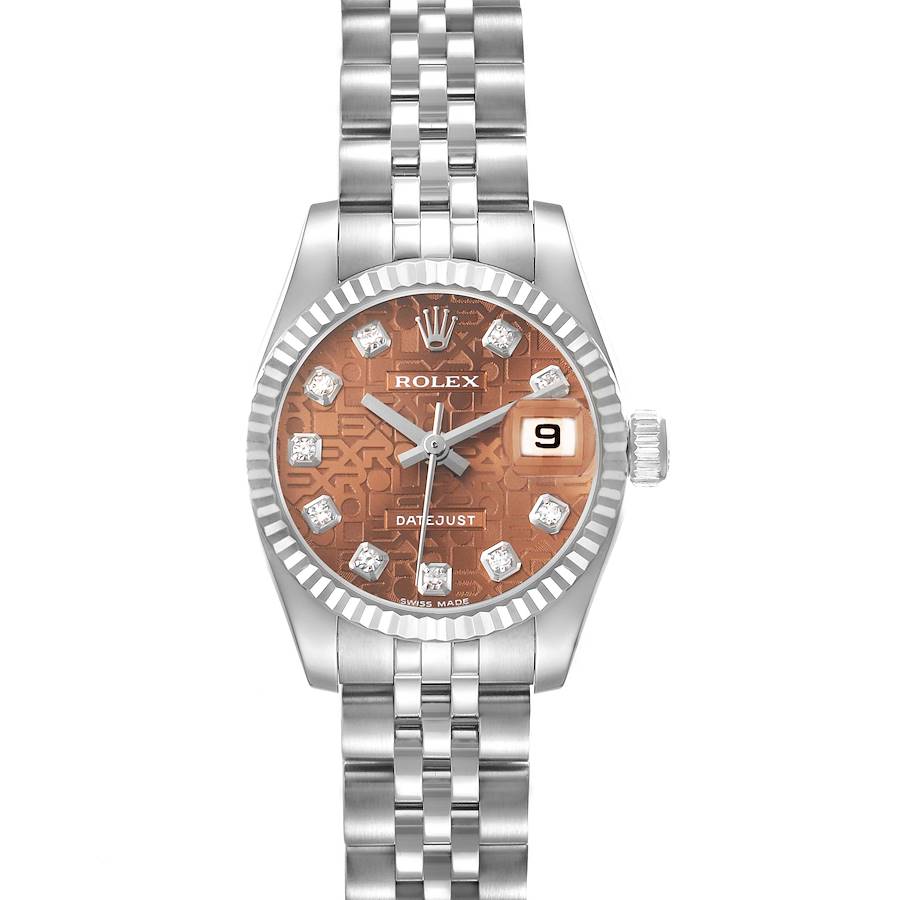 Rolex Datejust Steel White Gold Salmon Diamond Dial Ladies Watch 179174. Officially certified chronometer automatic self-winding movement. Stainless steel oyster case 26.0 mm in diameter. Rolex logo on the crown. 18K white gold fluted bezel. Scratch resistant sapphire crystal with cyclops magnifier. Salmon dial with Rolex factory diamond hour markers and baton hands. Date calendar at 3 o'clock aperture. Stainless steel jubilee bracelet with a hidden clasp. Fits a 6 1/2" wrist.
