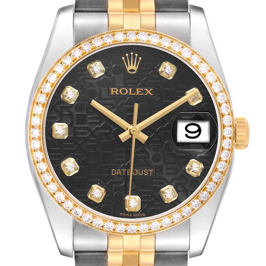 Rolex Datejust Steel Yellow Gold Anniversary Diamond Dial Mens Watch 116243. Officially certified chronometer automatic self-winding movement. Stainless steel case 36.0 mm in diameter. Rolex logo on a crown. 18k yellow gold bezel set with original Rolex factory diamonds. Scratch resistant sapphire crystal with cyclops magnifier. Black jubilee anniversary dial with original Rolex factory diamond hour markers. Date window at 3 o'clock aperture. Stainless steel and 18k yellow gold jubilee bracelet with hidden clasp. Fits a 7 1/4" wrist.