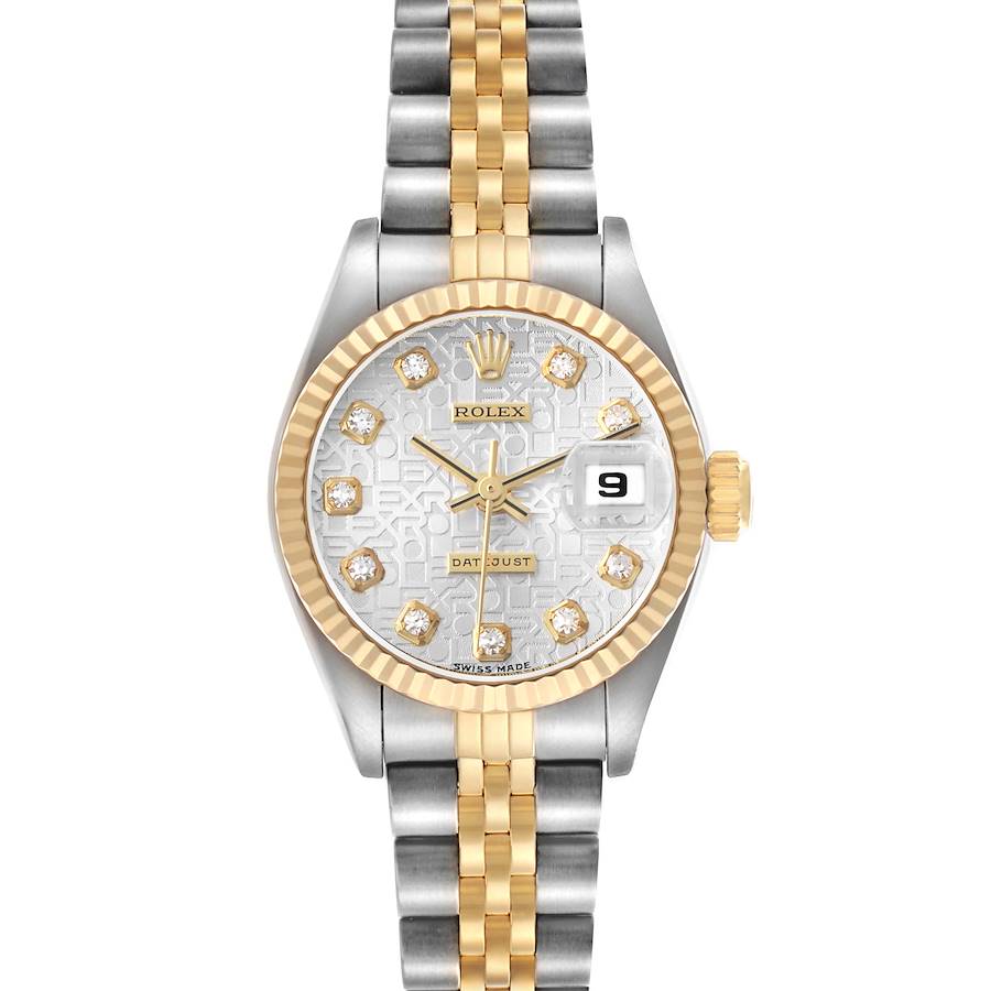 Rolex Datejust Steel Yellow Gold Anniversary Diamond Ladies Watch 79173. Officially certified chronometer automatic self-winding movement. Stainless steel oyster case 26.0 mm in diameter. Rolex logo on the 18K yellow gold crown. 18k yellow gold fluted bezel. Scratch resistant sapphire crystal with cyclops magnifier. Silver jubilee anniversary dial with original Rolex factory diamond hour markers and yellow gold baton hands. Date calendar at the 3 o'clock aperture. Stainless steel and 18k yellow gold jubilee bracelet with a fold-over clasp. Fits a 6.5" wrist.
