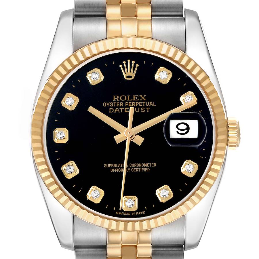 Rolex Datejust Steel Yellow Gold Black Diamond Dial Mens Watch 116233. Officially certified chronometer automatic self-winding movement. Stainless steel oyster case 36.0 mm in diameter. Rolex logo on the 18k yellow gold crown. 18k yellow gold fluted bezel. Scratch resistant sapphire crystal with a cyclops magnifier. Black dial with original Rolex factory diamond hour markers and yellow gold baton hands. Date calendar at the 3 o'clock aperture. Stainless steel and 18k yellow gold jubilee bracelet with a hidden clasp. Fits a 7 1/4" wrist.