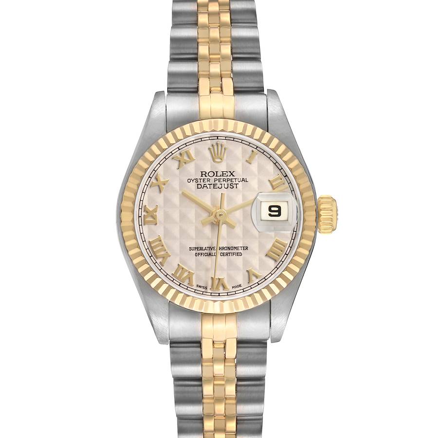 Rolex Datejust Steel Yellow Gold Ivory Roman Dial Ladies Watch 79173. Officially certified chronometer automatic self-winding movement. Stainless steel oyster case 26.0 mm in diameter. Rolex logo on the 18K yellow gold crown. 18k yellow gold fluted bezel. Scratch resistant sapphire crystal with cyclops magnifier. Ivory pyramid dial with raised yellow gold Roman numeral hour markers and yellow gold baton hands. Date calendar at the 3 o'clock aperture. Stainless steel and 18k yellow gold jubilee bracelet with a fold-over clasp. Fits a 6 1/2" wrist.