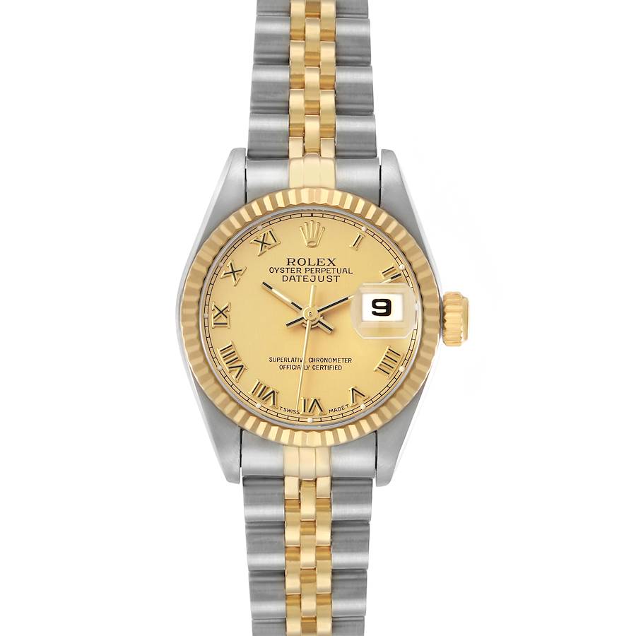 Rolex Datejust Steel Yellow Gold Roman Dial Ladies Watch 69173. Officially certified chronometer automatic self-winding movement. Stainless steel oyster case 26.0 mm in diameter. Rolex logo on the 18k yellow gold crown. 18k yellow gold fluted bezel. Scratch-resistant sapphire crystal with a cyclops magnifier. Champagne dial with yellow gold raised Roman numeral hour markers and baton hands. Date calendar at the 3 o'clock aperture. Stainless steel and 18k yellow gold jubilee bracelet with a folding clasp. Fits a 6.5" wrist.