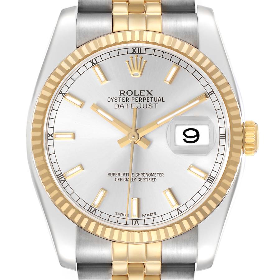 Rolex Datejust Steel Yellow Gold Silver Dial Mens Watch 116233. Officially certified chronometer automatic self-winding movement. Stainless steel oyster case 36.0 mm in diameter. Rolex logo on the 18k yellow gold crown. 18k yellow gold fluted bezel. Scratch resistant sapphire crystal with a cyclops magnifier. Silver dial with raised yellow gold-outlined luminescent baton hour markers and hands. Date calendar at the 3 o'clock aperture. Stainless steel and 18k yellow gold jubilee bracelet with a hidden clasp. Fits a 7" wrist.